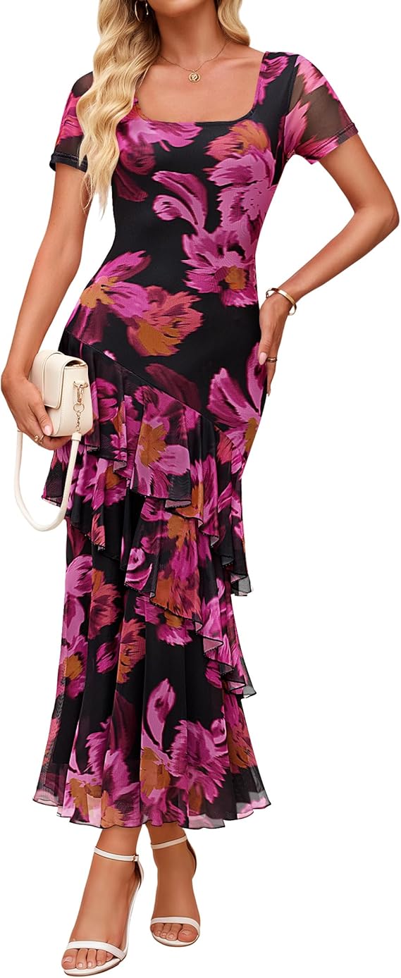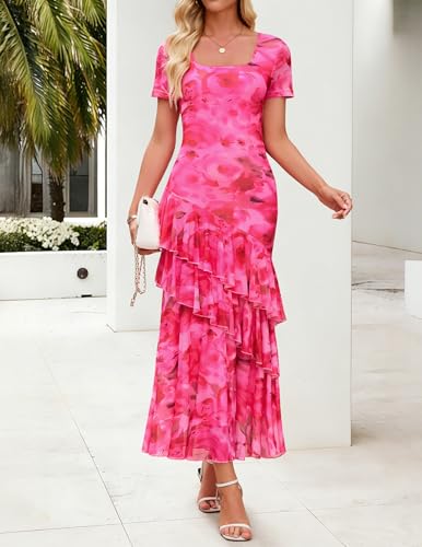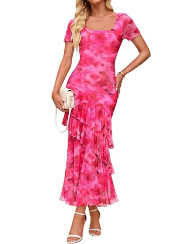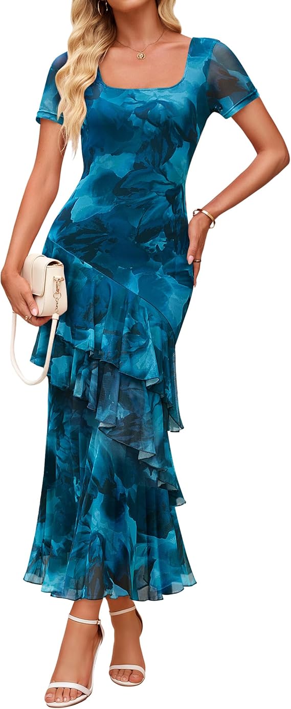 ZESICA Women's Summer Floral Bodycon Maxi Dress 2026 Square Neck Mesh Ruffle Elegant Cocktail Wedding Party Long Dresses