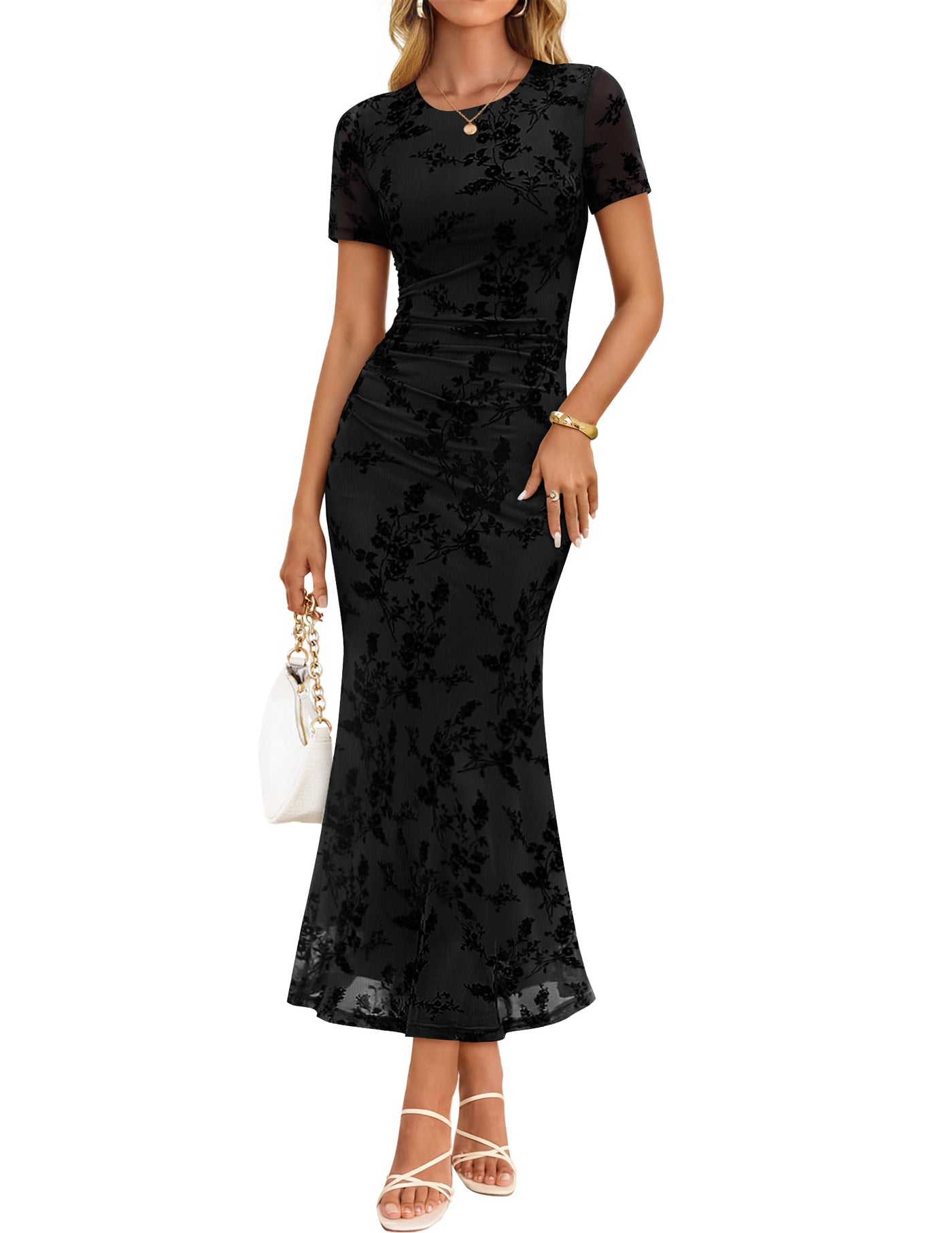 ZESICA Women's Summer Short Sleeve Floral Bodycon Dress 2026 Ruched Mesh Wedding Guest Cocktail Party Maxi Dresses