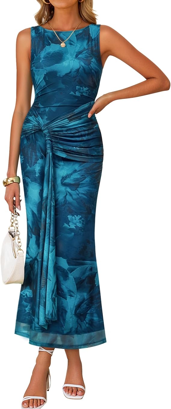 ZESICA Women's Summer Sleeveless Bodycon Dress 2026 Crewneck Ruched Sexy Mesh Wedding Guest Cocktail Party Maxi Dresses
