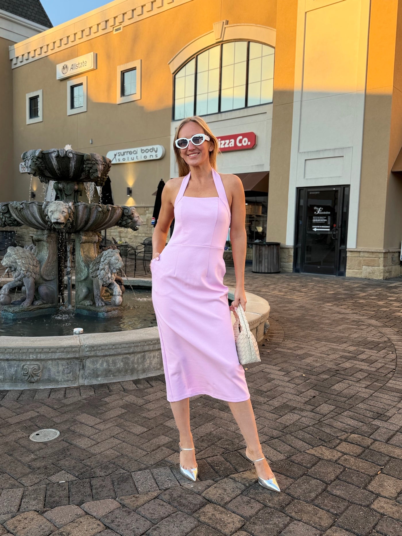Stylish sleeveless halter neck dress, featuring an off the shoulder and open back design. This versatile summer midi dress boasts a sexy back slit and classic solid color. Equipped with side pockets, it's the great piece for transitioning from daytime work to evening parties
