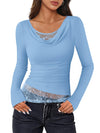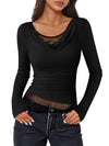 Material: Crafted from a soft, stretchy fabric with delicate lace lining, this top provides lightweight warmth and breathable comfort. Ideal for layering or wearing solo during crisp fall weather.