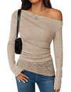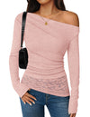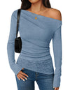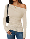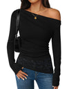 Design: This Y2K off shoulder top features a chic boat neck and delicate lace hem. Long sleeves, subtle ruched detailing, and a feminine slim fit create a figure-flattering silhouette ideal for showcasing your personal style.