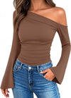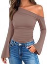 Features: Off shoulder tops for women, trendy long sleeve tops, bell sleeve, solid color, fall fashion tops, ruched tops, Y2K tops, plain t shirts for women, sexy fitted tops, dressy casual, going out tops, winter undershirts, black tops, white long sleeve shirts, brown tops, red tops