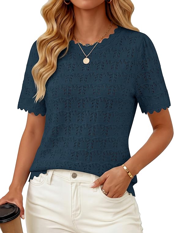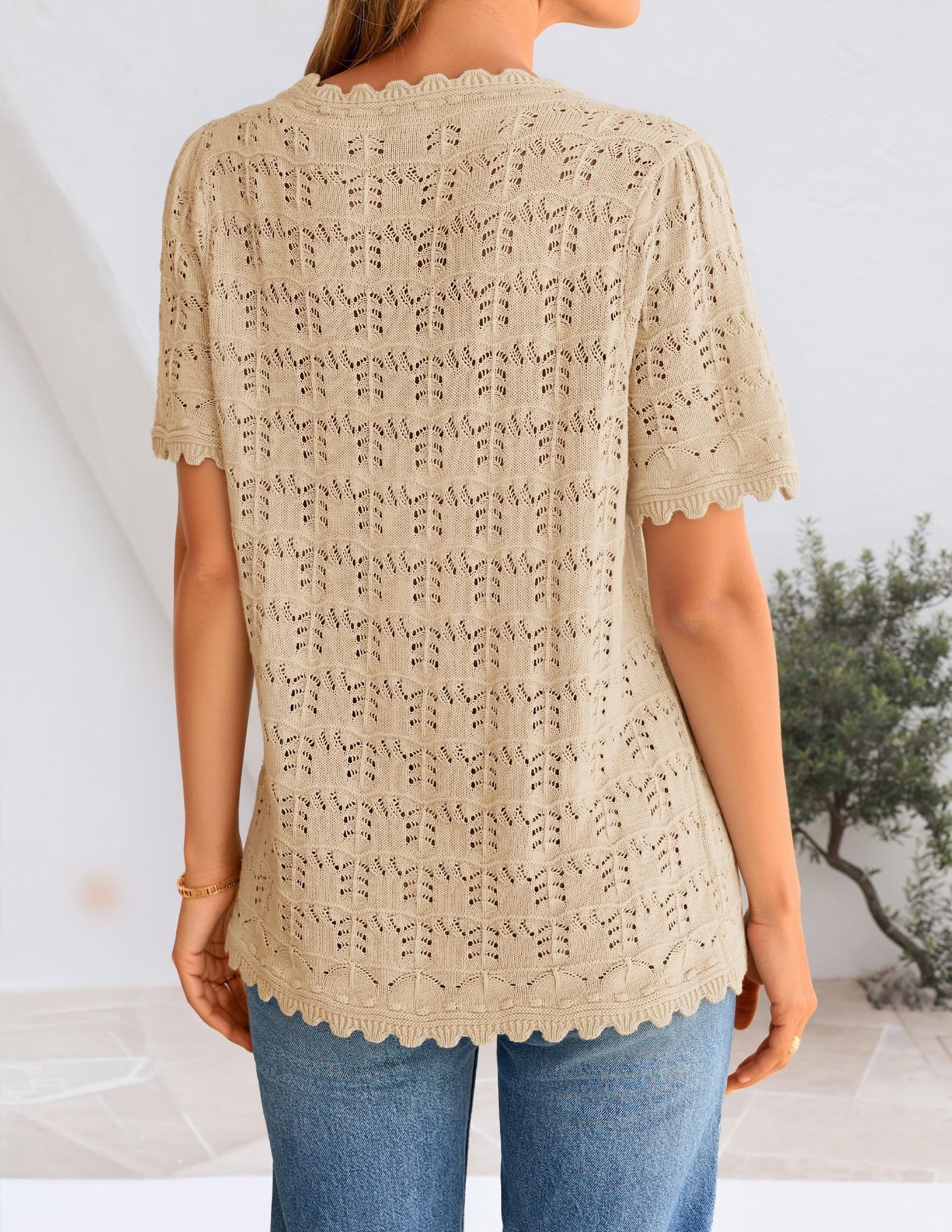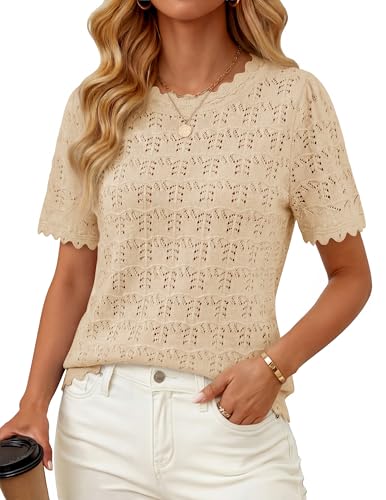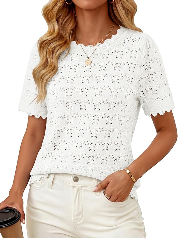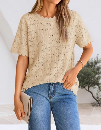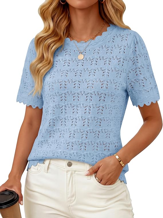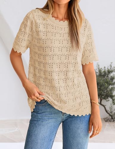 ZESICA Women’s Crochet Short Sleeve Sweaters 2026 Summer Casual Crewneck Hollow Out Tops Beach Vacation Shirts Outfits