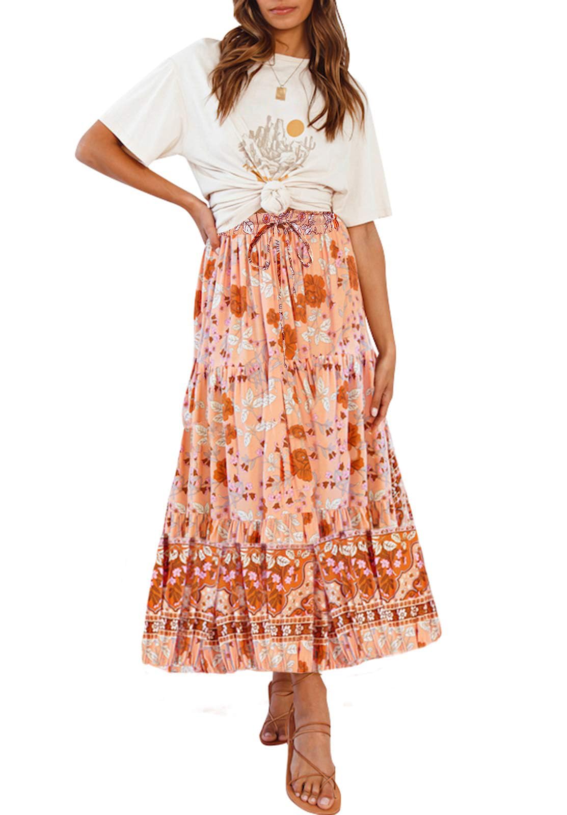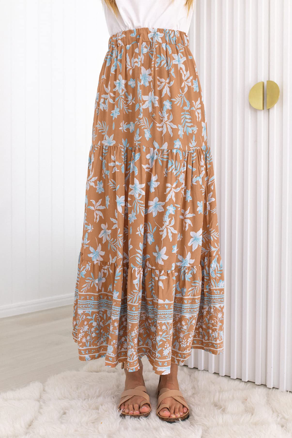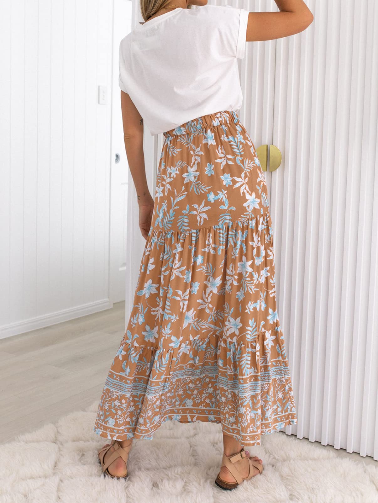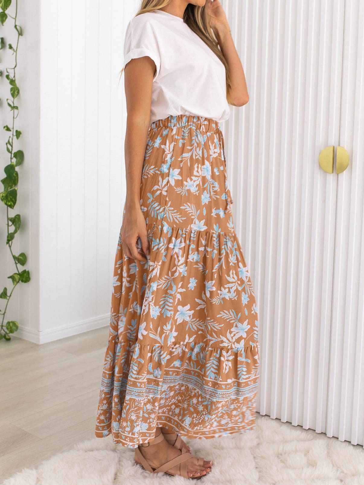 ZESICA Women's 2026 Summer Bohemian Floral Printed Elastic Waist A Line Maxi Skirt with Pockets,Clay,X-Small