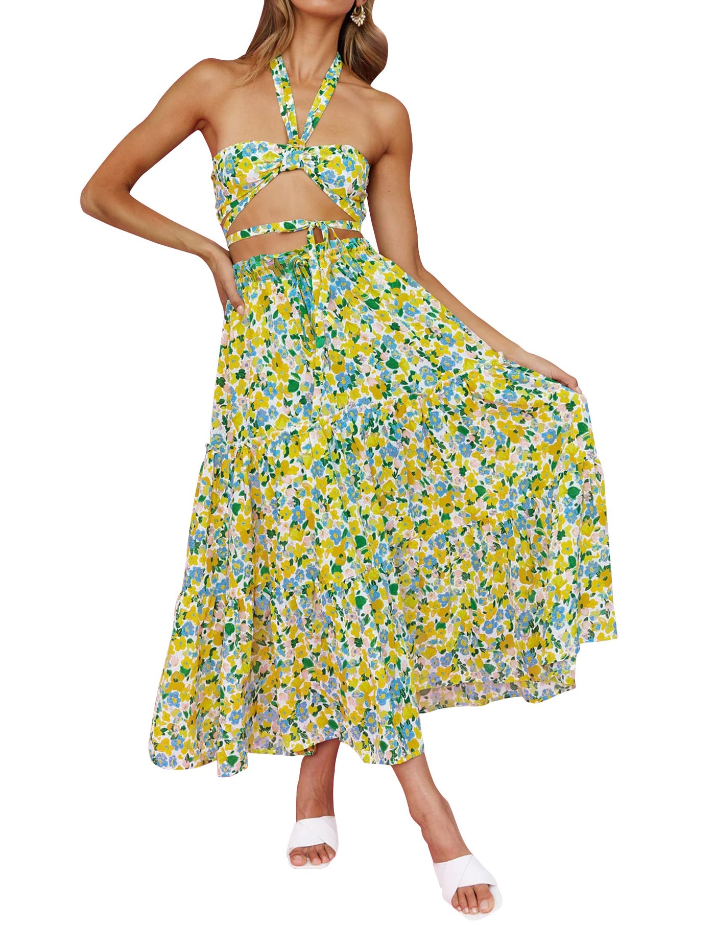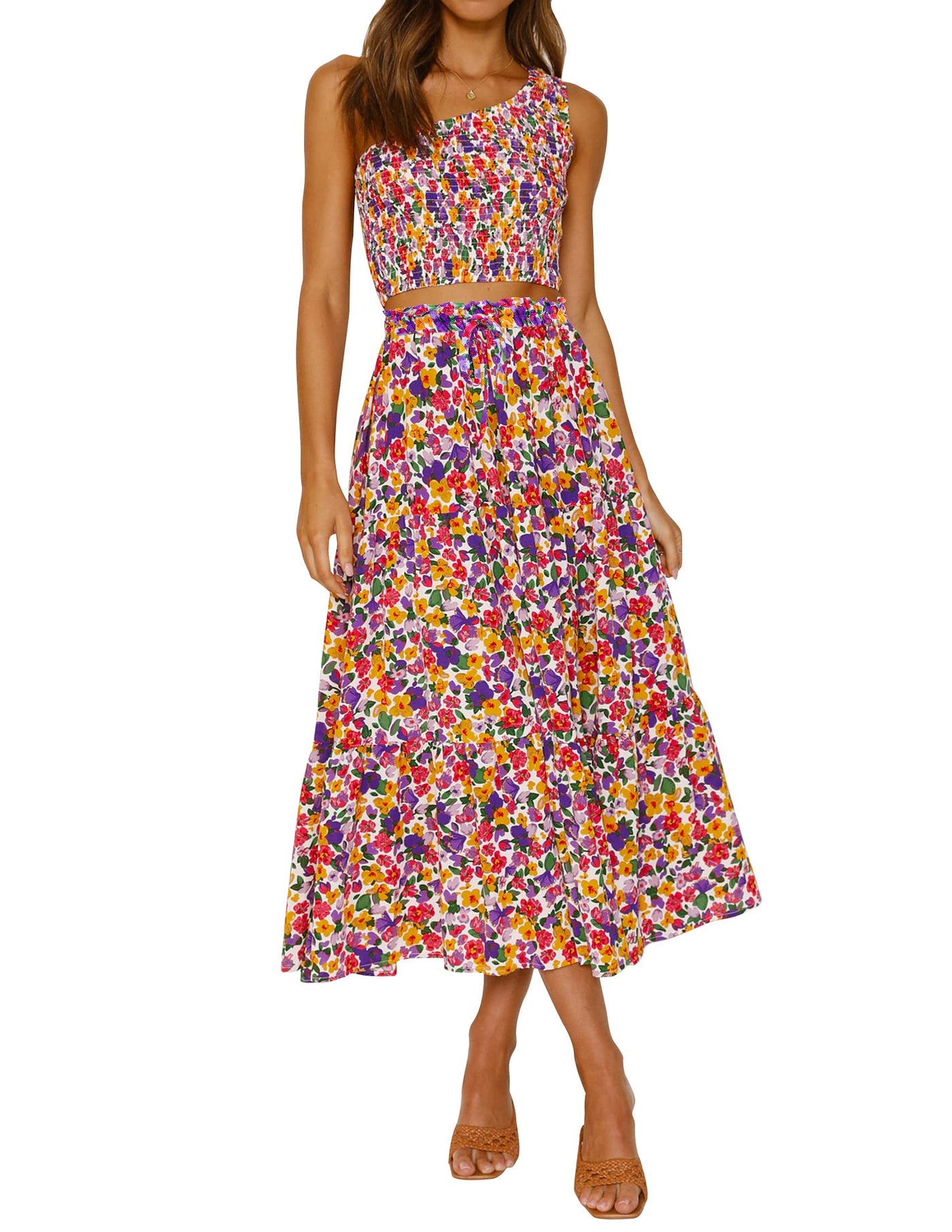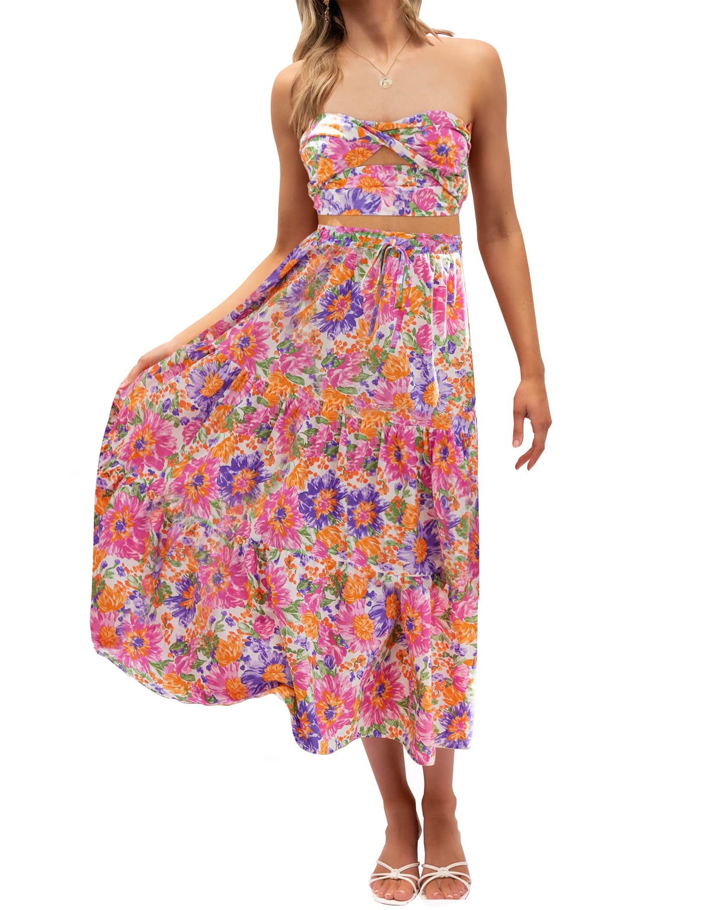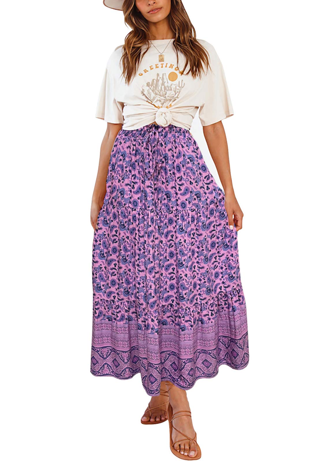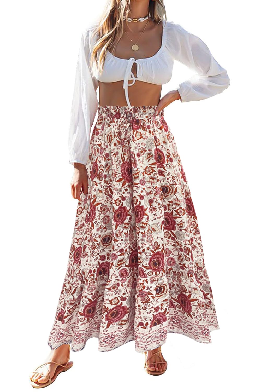 ZESICA Women's 2026 Summer Bohemian Floral Printed Elastic Waist A Line Maxi Skirt with Pockets,Clay,X-Small