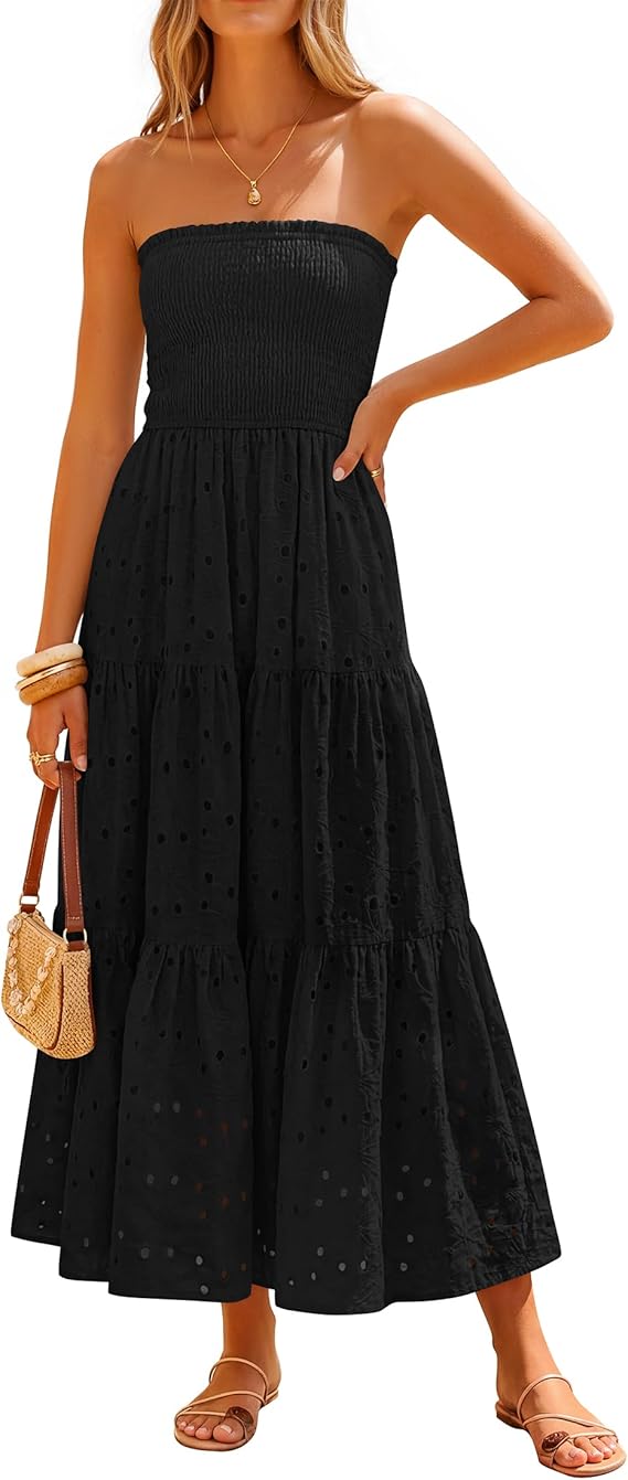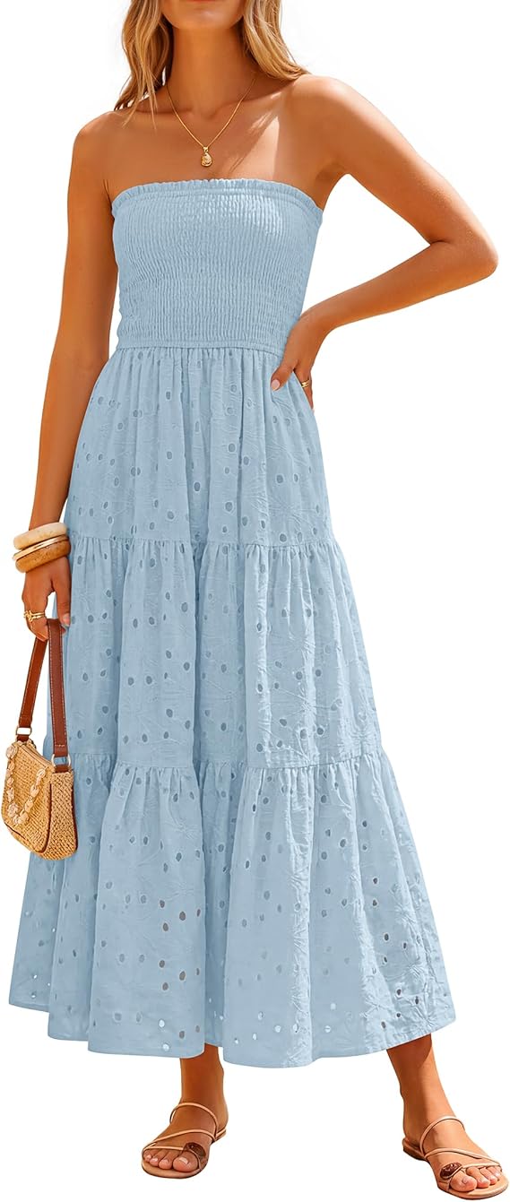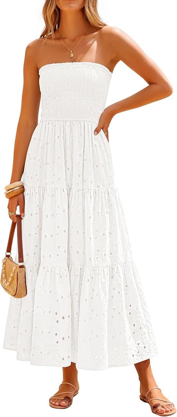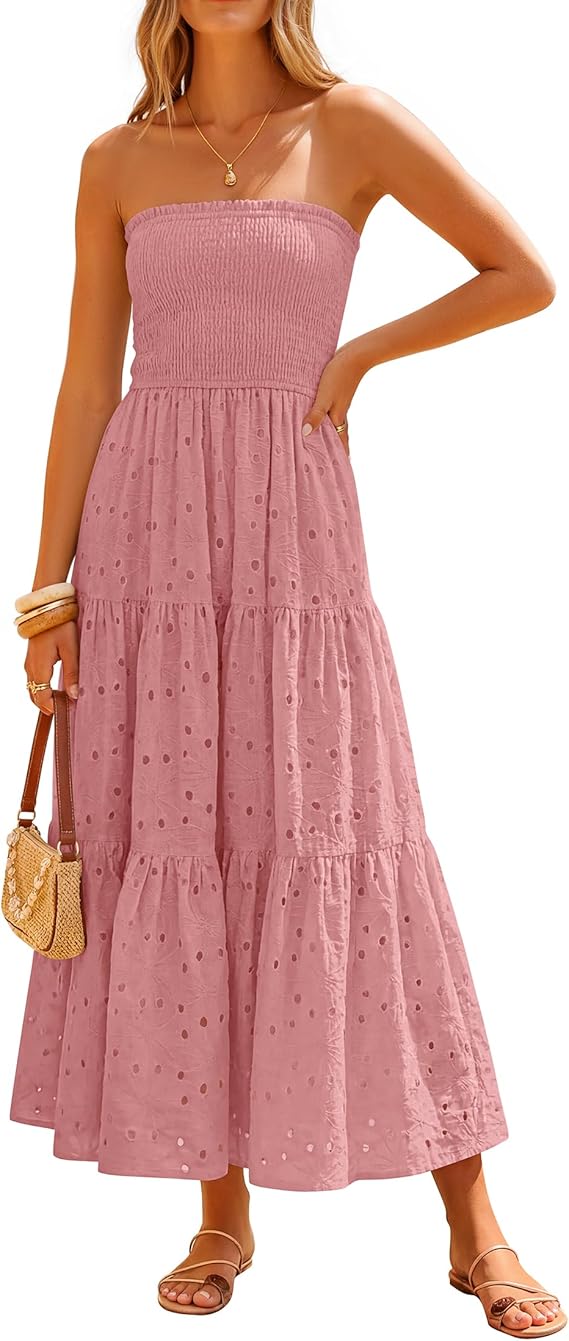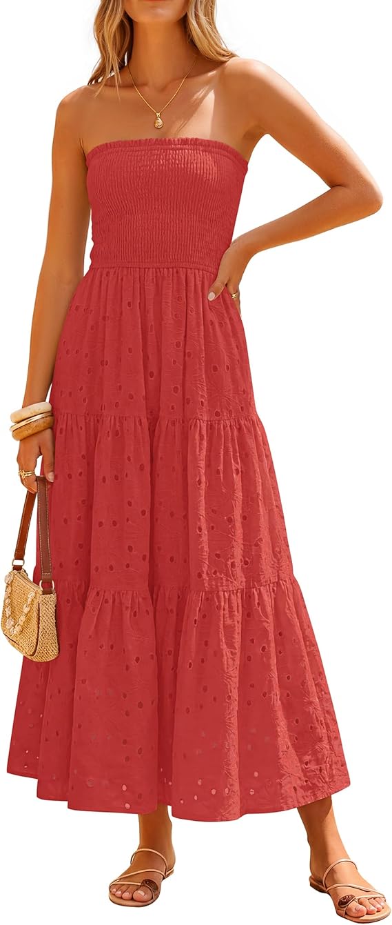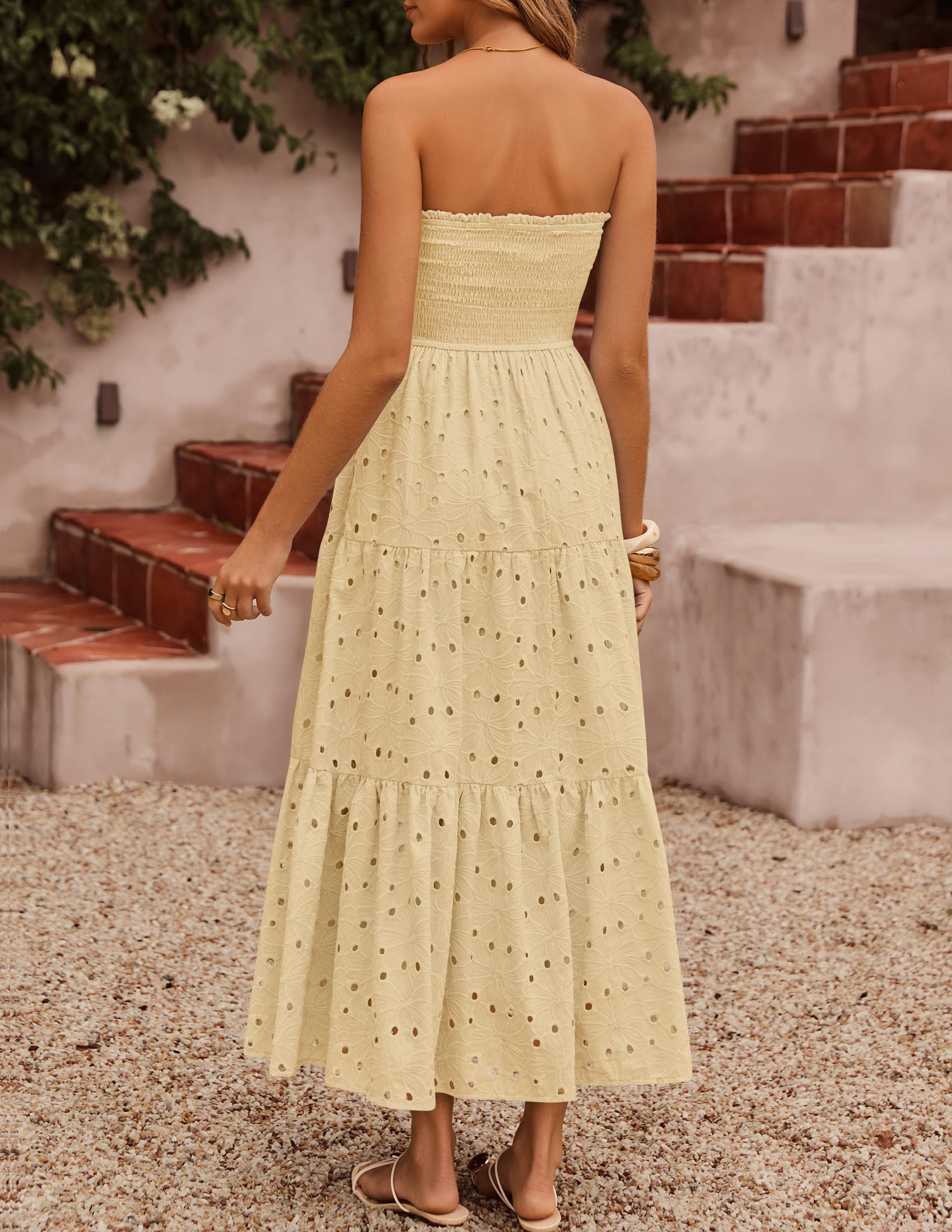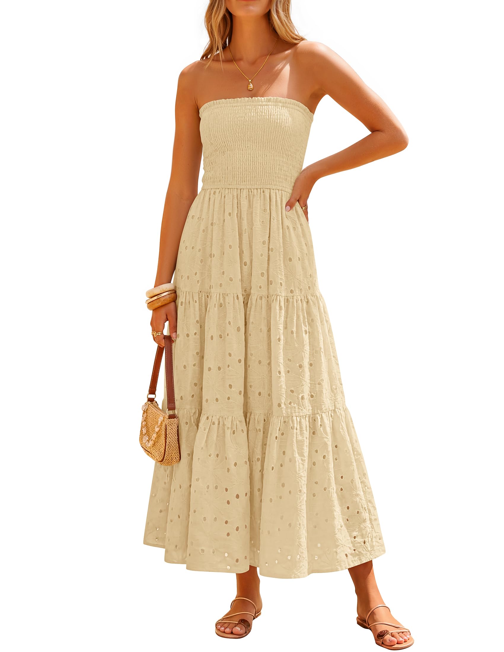 ZESICA Womens 2026 Summer Boho Strapless Midi Dresses Off Shoulder Smocked Eyelet Flowy Casual Beach Long Dress Pockets