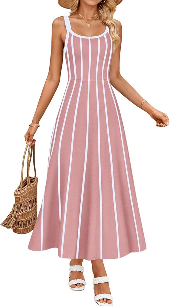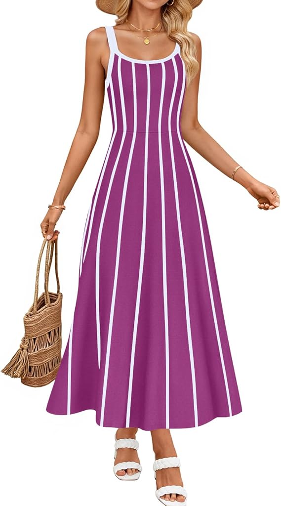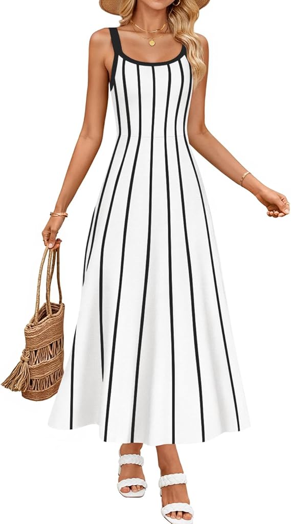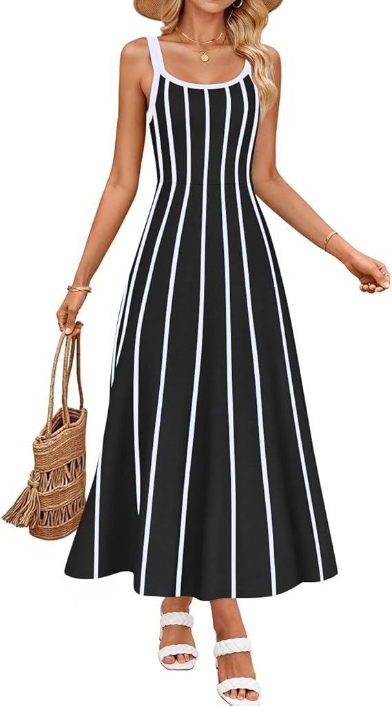 ZESICA Womens 2026 Summer Sleeveless Striped Midi Dresses Casual A Line Swing Knit Long Dress Beach Vacation Clothes