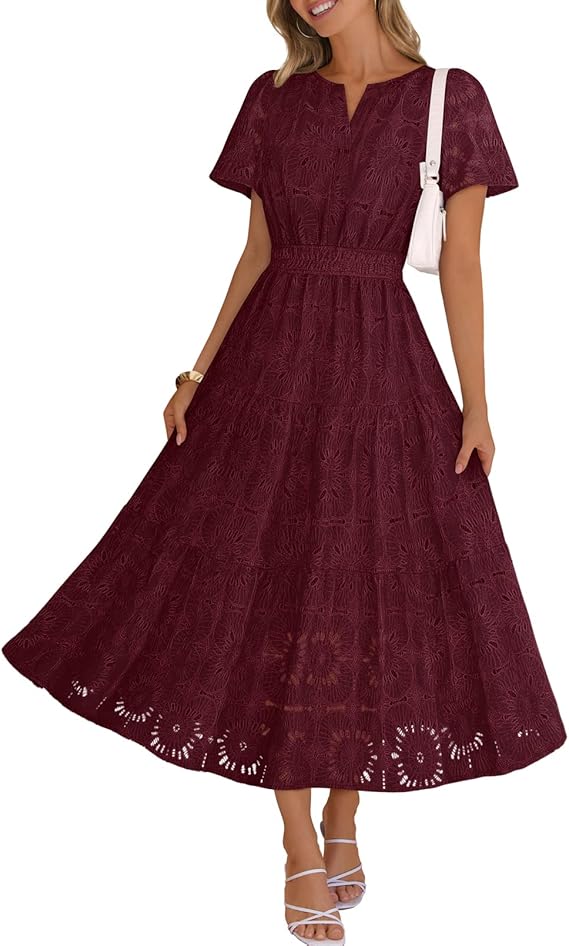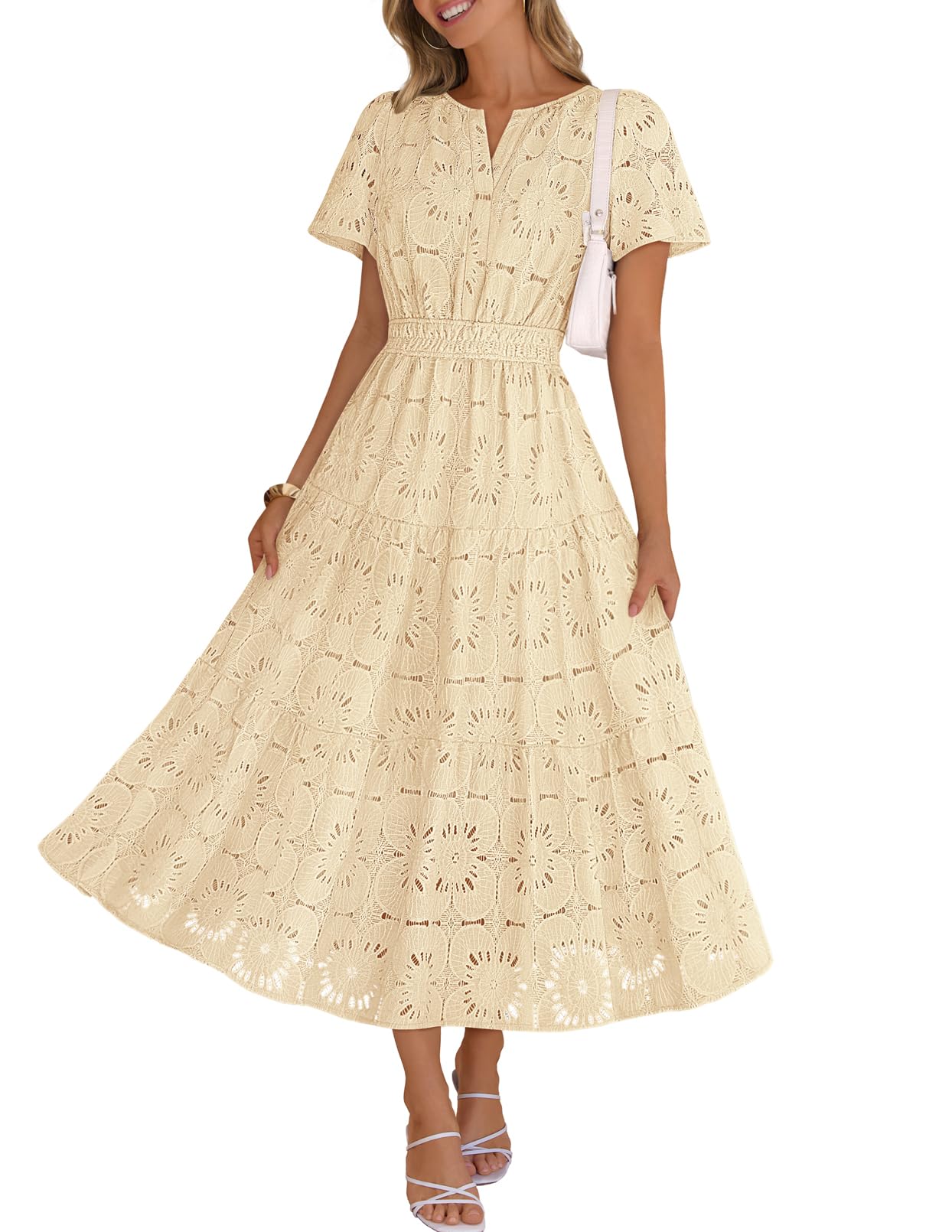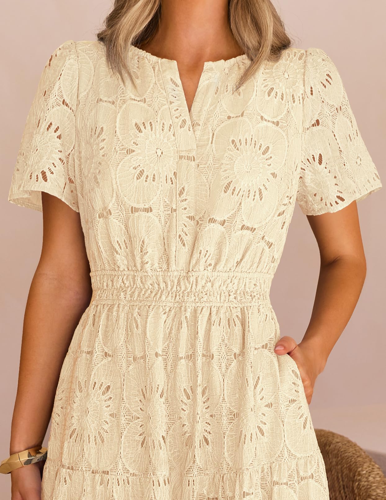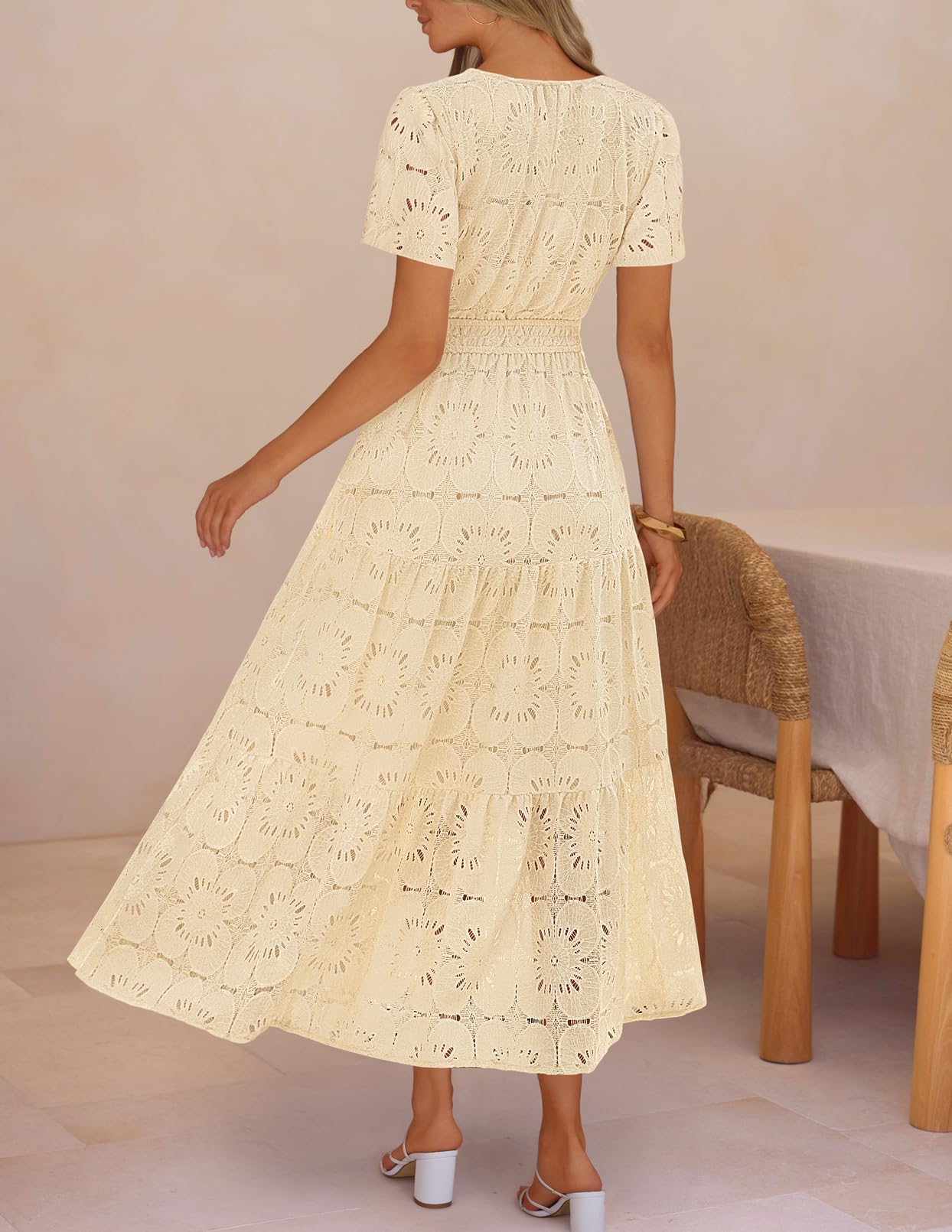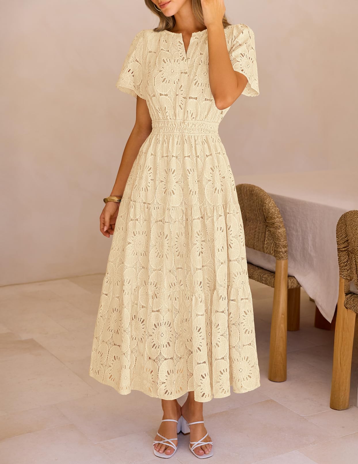 ZESICA Women's Spring Summer Floral Maxi Dress 2026 Boho Eyelet Hollow Out Lace Short Sleeve A Line Tiered Flowy Dresses