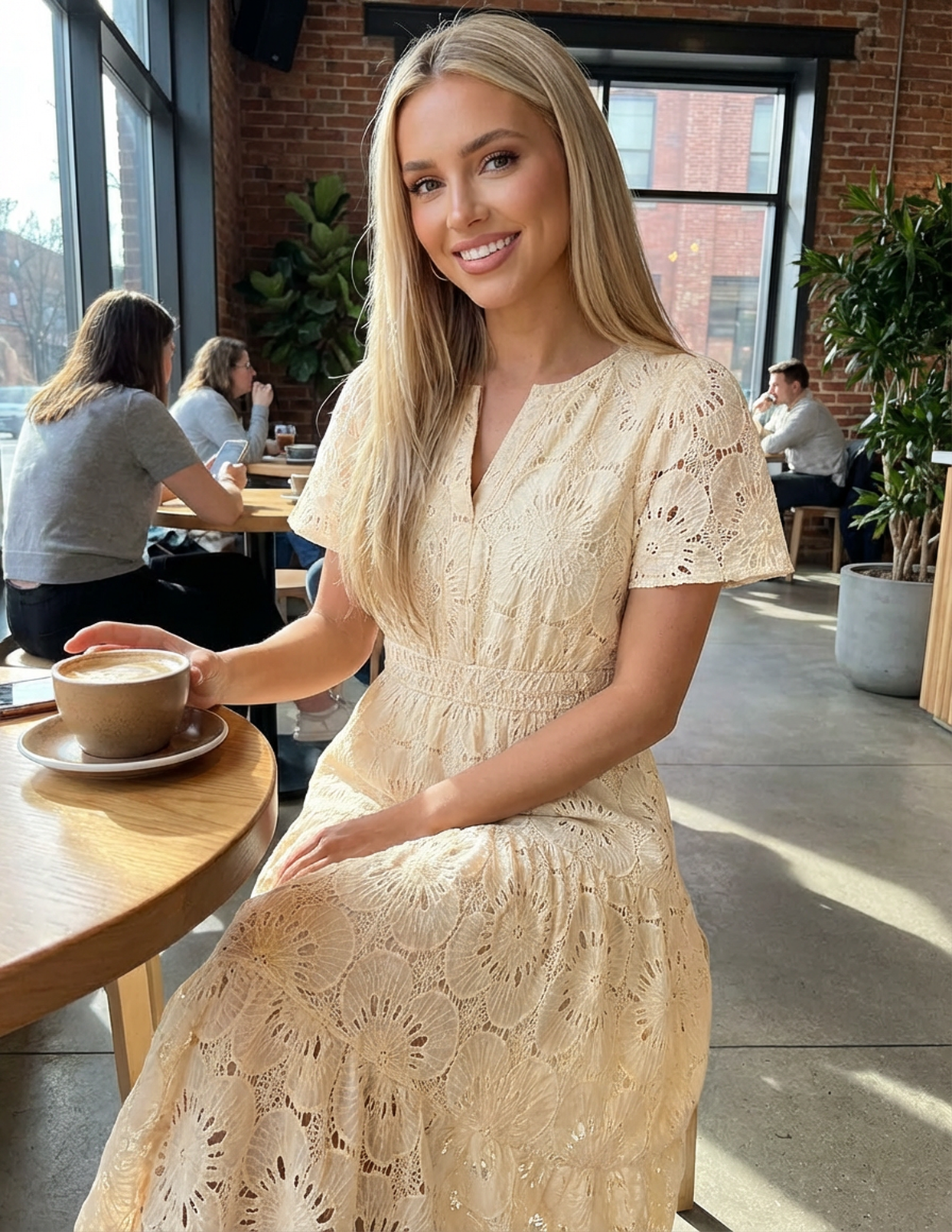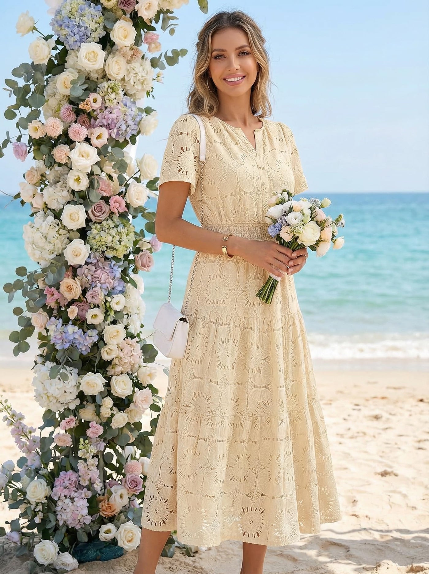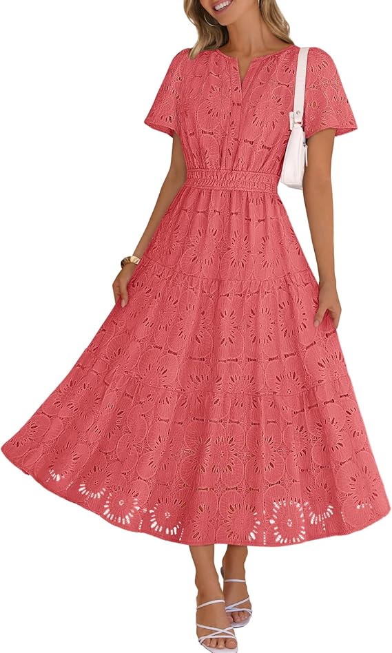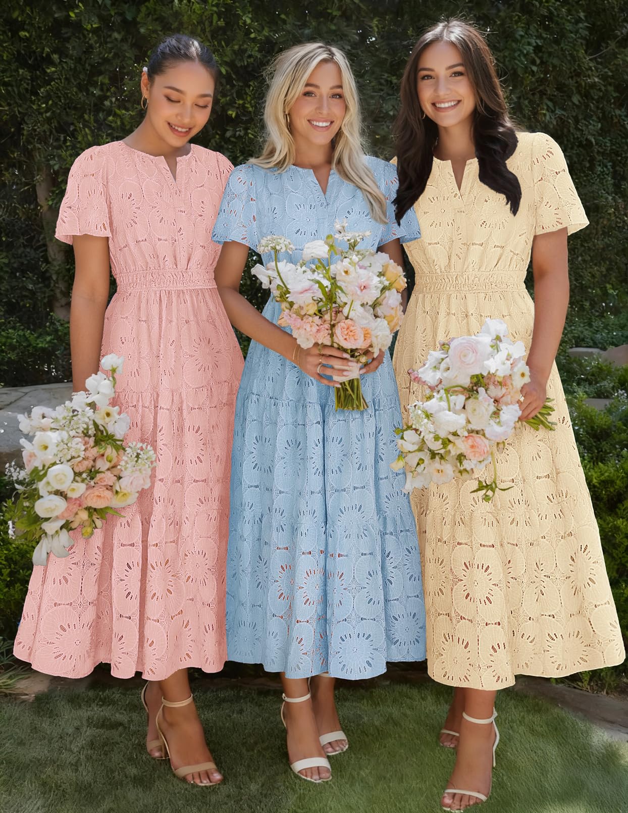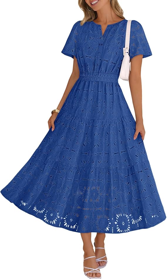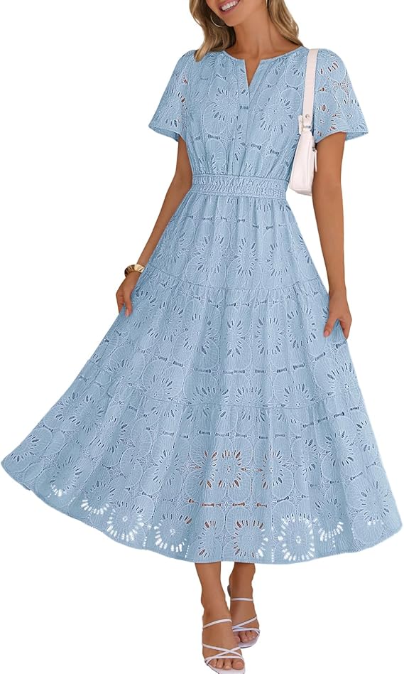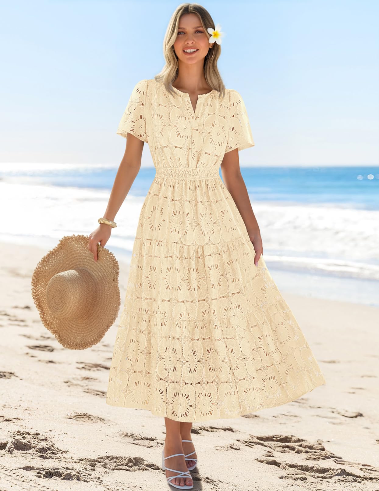 ZESICA Women's Spring Summer Floral Maxi Dress 2026 Boho Eyelet Hollow Out Lace Short Sleeve A Line Tiered Flowy Dresses