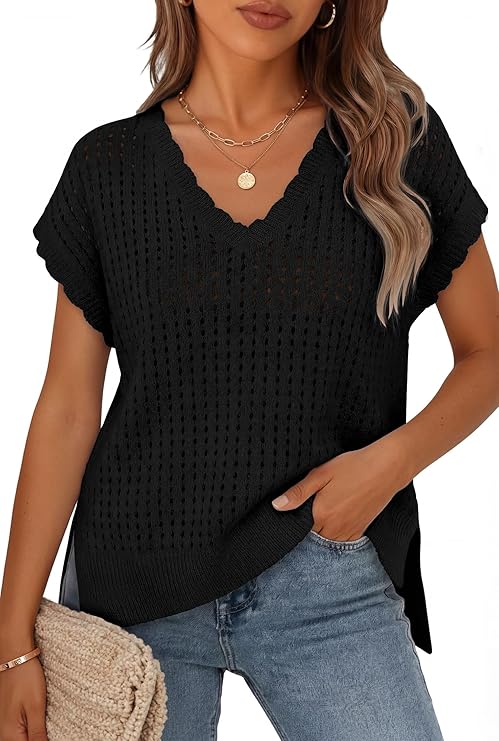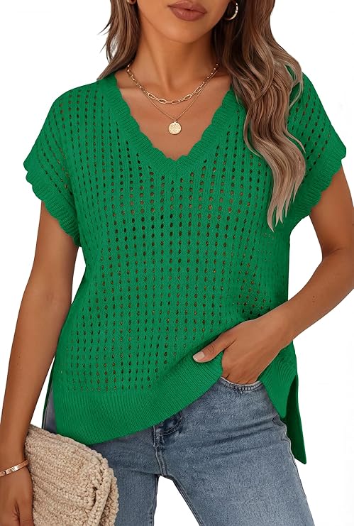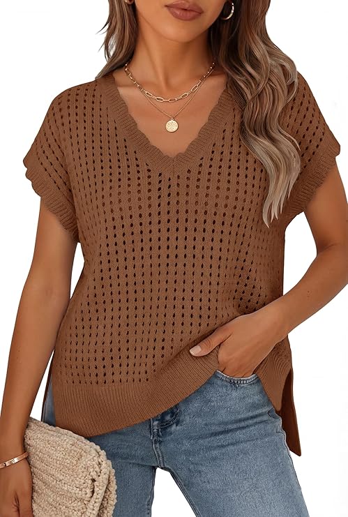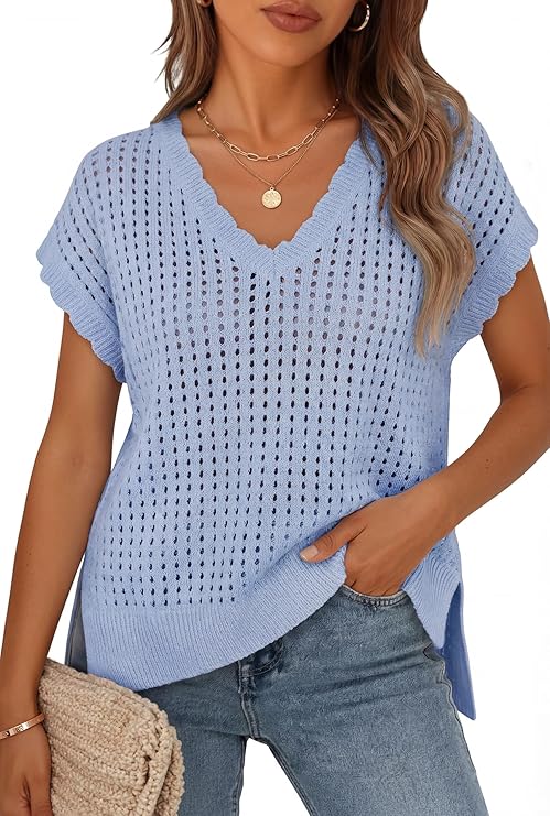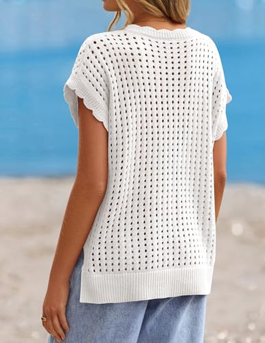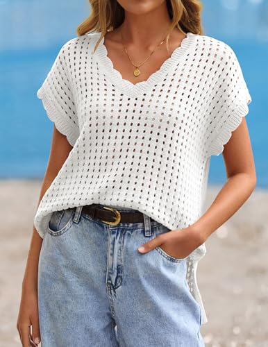 ZESICA Women's Spring Tops 2026 Summer Shirts Crochet V Neck Cap Sleeve Sweater Cute Casual Beach Vacation Clothes